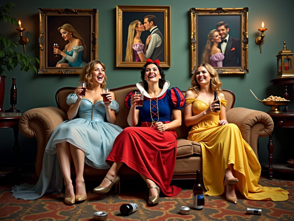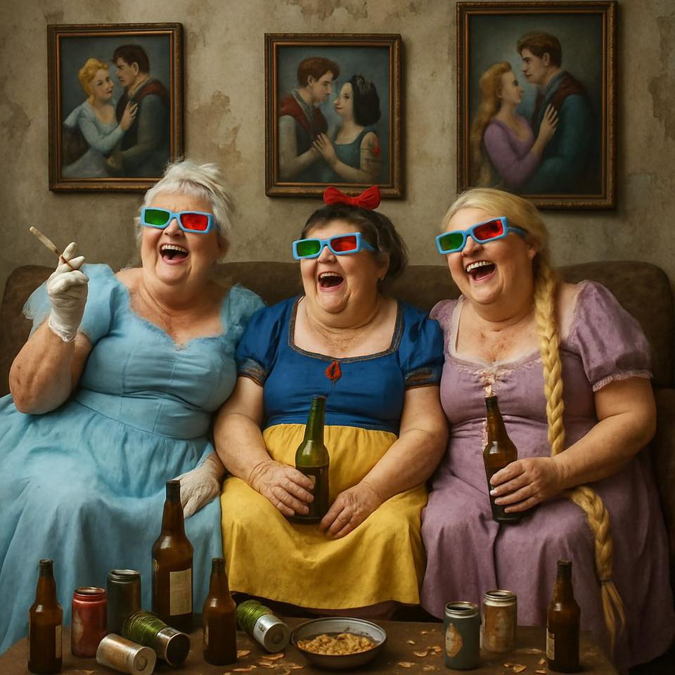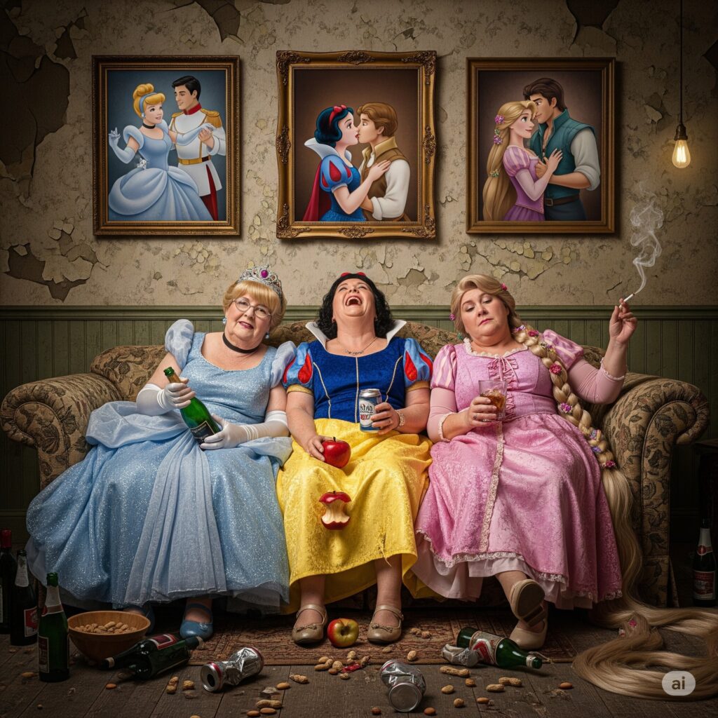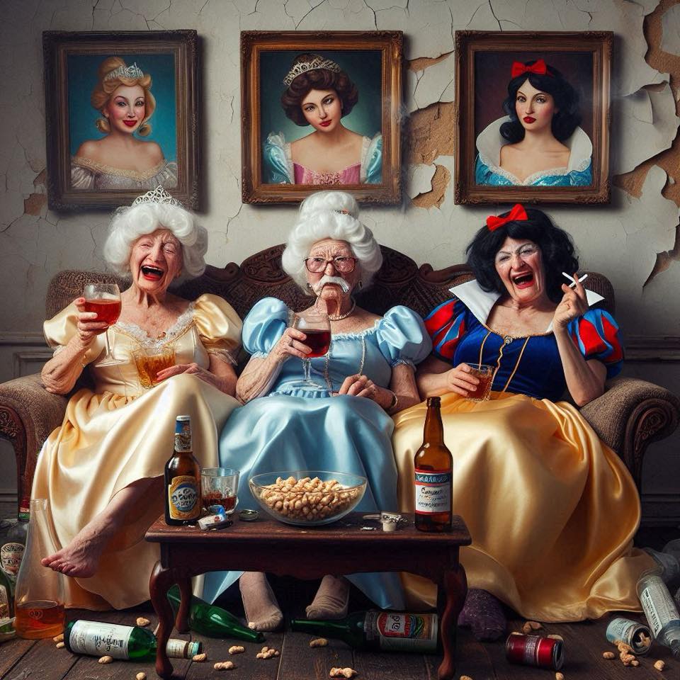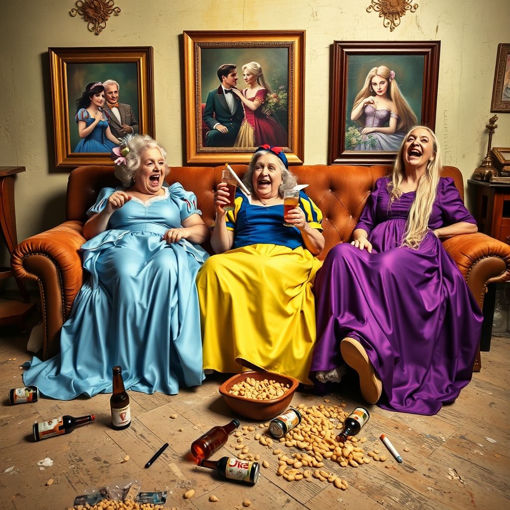 Crée une scène humoristique où trois femmes très âgées enrobées, déguisées en princesses de contes de fées (Cendrillon, Blanche-Neige et Raiponce), sont affalées sur un vieux canapé dans une pièce délabrée. Elles tiennent des boissons alcoolisées en main, rient bruyamment, et sont entourées de bouteilles et de canettes vides éparpillées au sol, ainsi que d’un bol de cacahuètes renversé. Derrière elles, des portraits encadrés montrent des versions idéalisées et romantiques de leurs jeunes moi avec leurs princes. Une cigarette allumée ajoute une touche de rébellion à l’ambiance chaotique.
