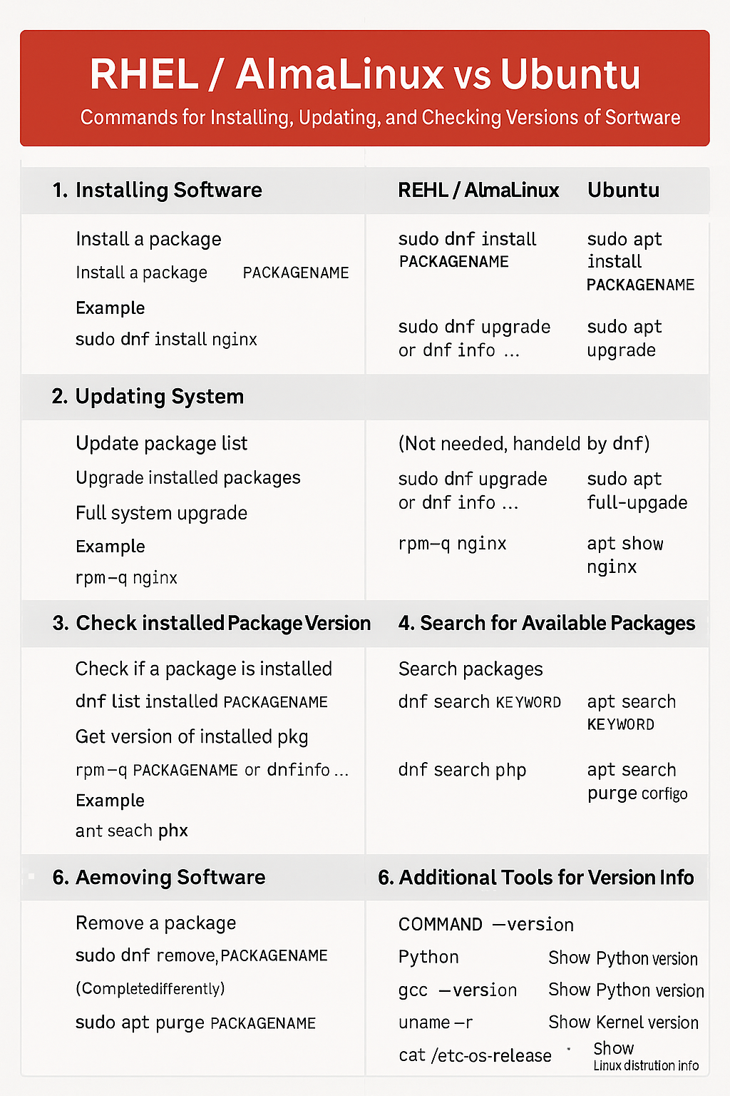 Some AlmaLinux commands are different from Ubuntu which I use on my desktop computers. I asked ChatGPT to generate a cheat sheet comparing commands between the two systems.
