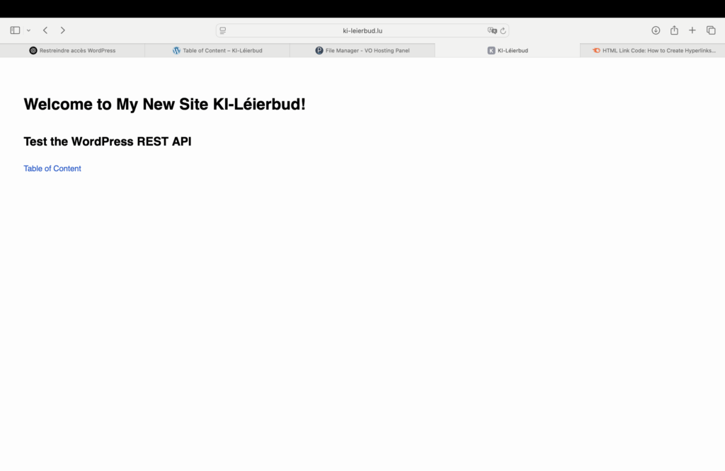 To install a customized minimal web Homepage allowing to test the correct working of the WordPress REST API, I removed all the files in the “home directory > httpdocs” folder, except the index.html file. I replaced the content of this file with the following code :