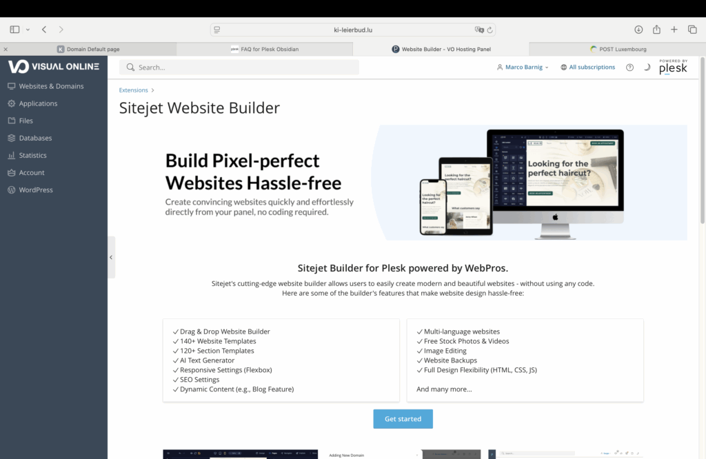 To replace the default home-page by a custom webpage I used the recommended website builder Sitejet :