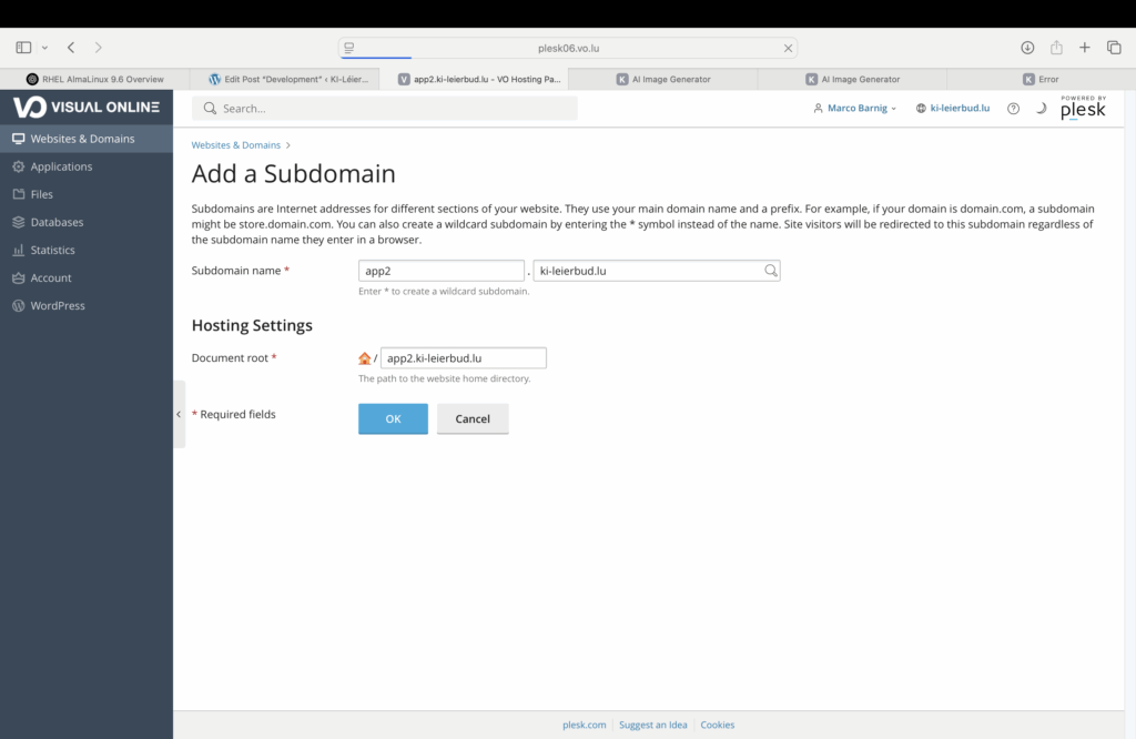 The following screenshot shows the configuration of a subdomain in the Plesk Dashboard :