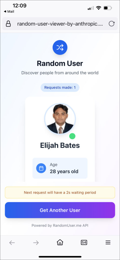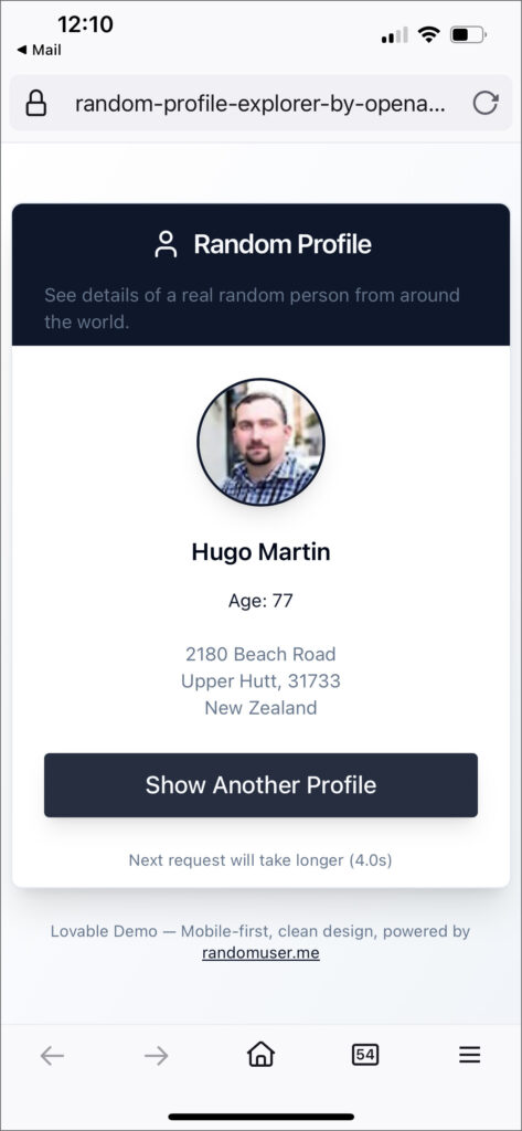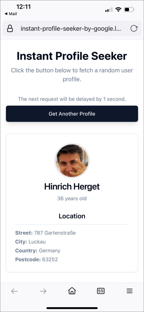 Ein Proof of Concept, der darauf abzielt, den missbräuchlichen Einsatz kostenloser GenAI‑Dienste einzudämmen. Die App nutzt randomuser.me, um fiktive Profile (Foto, Name, Alter, Adresse) abzurufen. Ein fortschreitender Delay‑Mechanismus verlangsamt jede weitere Anfrage in derselben Sitzung, um Überlastung zu vermeiden.