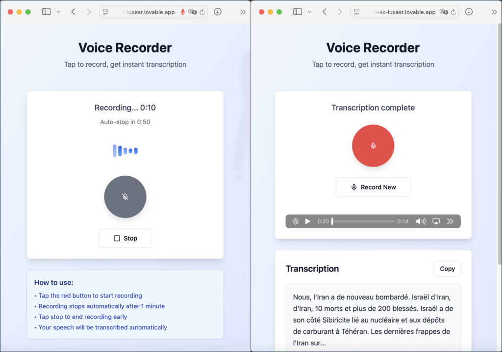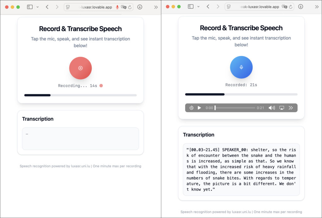Eine Sprach‑zu‑Text‑App, mit der Nutzer eine Sprachnachricht auf Smartphone oder Computer aufnehmen und per API an das Lux‑ASR‑System der Universität Luxemburg senden können.
