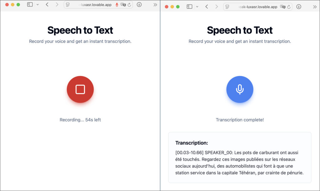 Lux‑ASR erkennt automatisch Luxemburgisch, Französisch, Deutsch, Englisch, Portugiesisch und Spanisch. Die Rücktranskription wird sofort angezeigt.