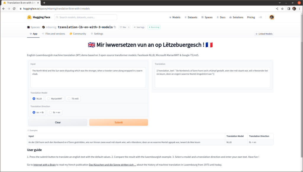 En 2022, j’ai développé un espace de démonstration pour la traduction anglais ↔ luxembourgeois avec trois modèles d’IA open source : NLLB (Meta AI), MarianNMT (projet académique) et T5/mt5 (Google Research). Chaque utilisateur peut constater que, malgré leurs qualités, ces modèles sont encore loin du niveau requis pour obtenir un certificat C1 en luxembourgeois.