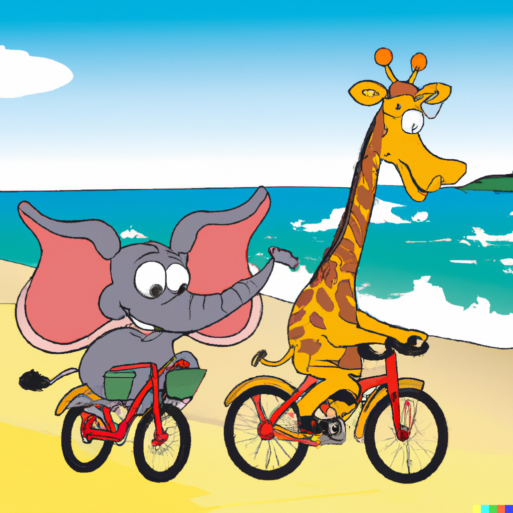 “cartoon of an elephant and a giraffe riding a bicycle on the beach”