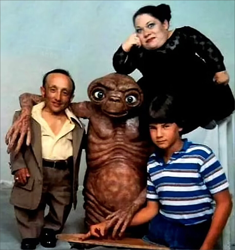 Un autre film emblématique est E.T. l’extra-terrestre de Steven Spielberg (1982), chef-d’œuvre du cinéma de science-fiction. À l’époque, les technologies de synthèse 3D n’étaient pas encore assez avancées pour créer un personnage numérique crédible. Steven Spielberg fit donc appel à une combinaison de marionnettes, d’animatronique et de performances humaines. Trois personnes ont incarné E.T. : Pat Bilon (1,22 m), acteur atteint de nanisme, Tamara De Treaux (0,84 m), également actrice atteinte de nanisme et Matthew DeMeritt, un adolescent né sans jambes.