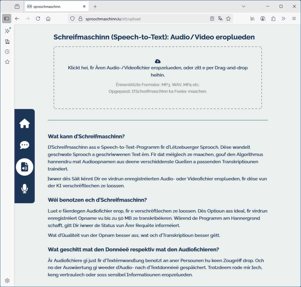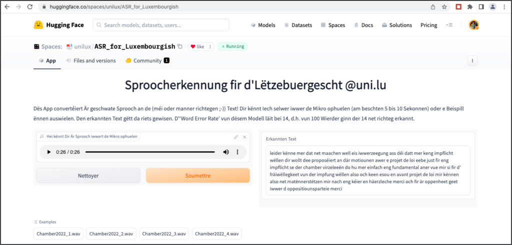 Enfin, j’étais la troisième personne, représentant la génération baby-boomer, également fasciné par l’ASR. Mes premiers développements se sont appuyés sur le modèle Coqui-STT. Fin juillet 2022, j’ai publié sur HuggingFace un modèle STT multilingue intitulé : « Mir verstinn och Lëtzebuergesch ». Mais très vite, j’ai dû reconnaître que face à la supériorité du modèle Whisper, mon projet ne pouvait pas rivaliser. J’ai donc décidé d’arrêter son développement.
