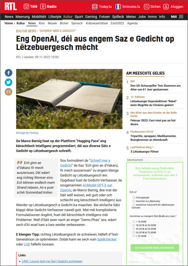 En novembre 2022 , RTL publia un court reportage sur mon projet de génération de poèmes luxembourgeois, mettant en lumière cette première expérience locale avec les grands modèles de langage.