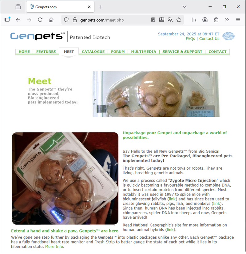 Le «GenPet» qu’on aperçoit dans le film est une œuvre d’art lancée en 2005 par l’artiste canadien Adam Brandejs. Ces sculptures animatroniques en latex, plastique et circuits électroniques simulaient de subtils signes de vie : respiration, tremblements, mouvements limités. Présentées comme des animaux bio-ingénierés pré-emballés, elles étaient accompagnées d’un faux site web, d’emballages sous blister, de « jauges de vitalité » et d’accessoires fictifs. Tout était conçu pour être crédible et provoquer la confusion entre art, science et marketing.