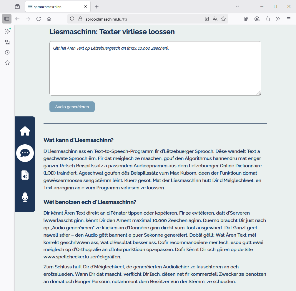 La responsabilité technique fut ensuite confiée à Christopher Morse, nouveau collaborateur du ZLS, spécialisé dans les technologies IA, qui adapta le modèle pour la production. Après quelques mois, le TTS fut installé sur les ordinateurs du gouvernement, aux côtés du système de reconnaissance vocale schreifmaschinn.lu (ASR), inauguré le 9 décembre 2022. Le projet prit finalement le nom Liesmaschinn.lu, intégré dans le portail combiné Sproochmaschinn.lu.