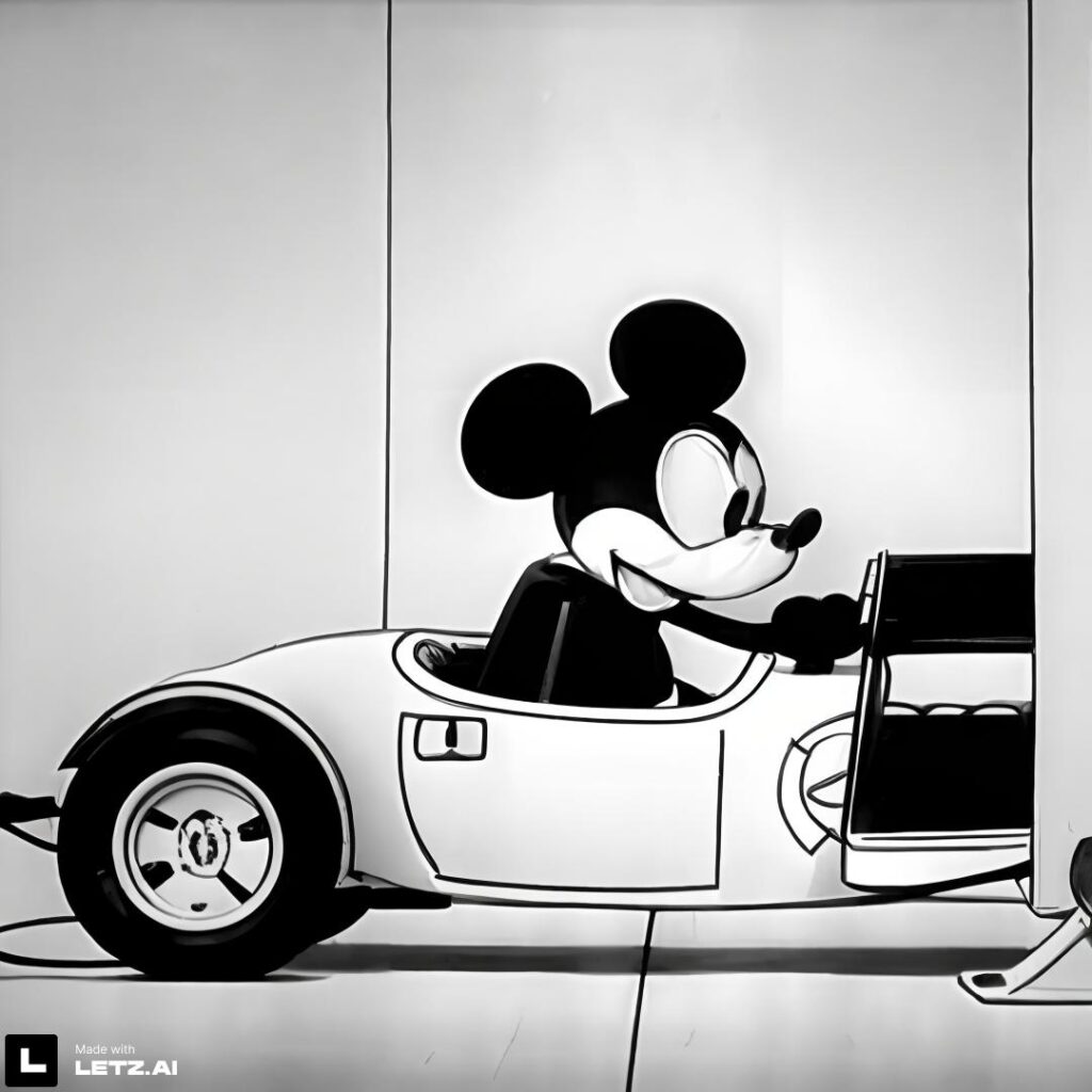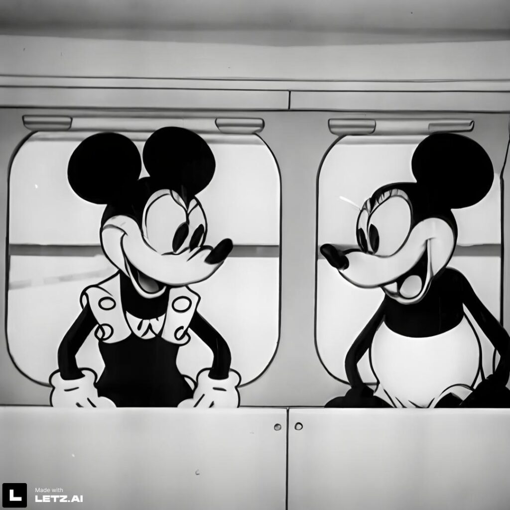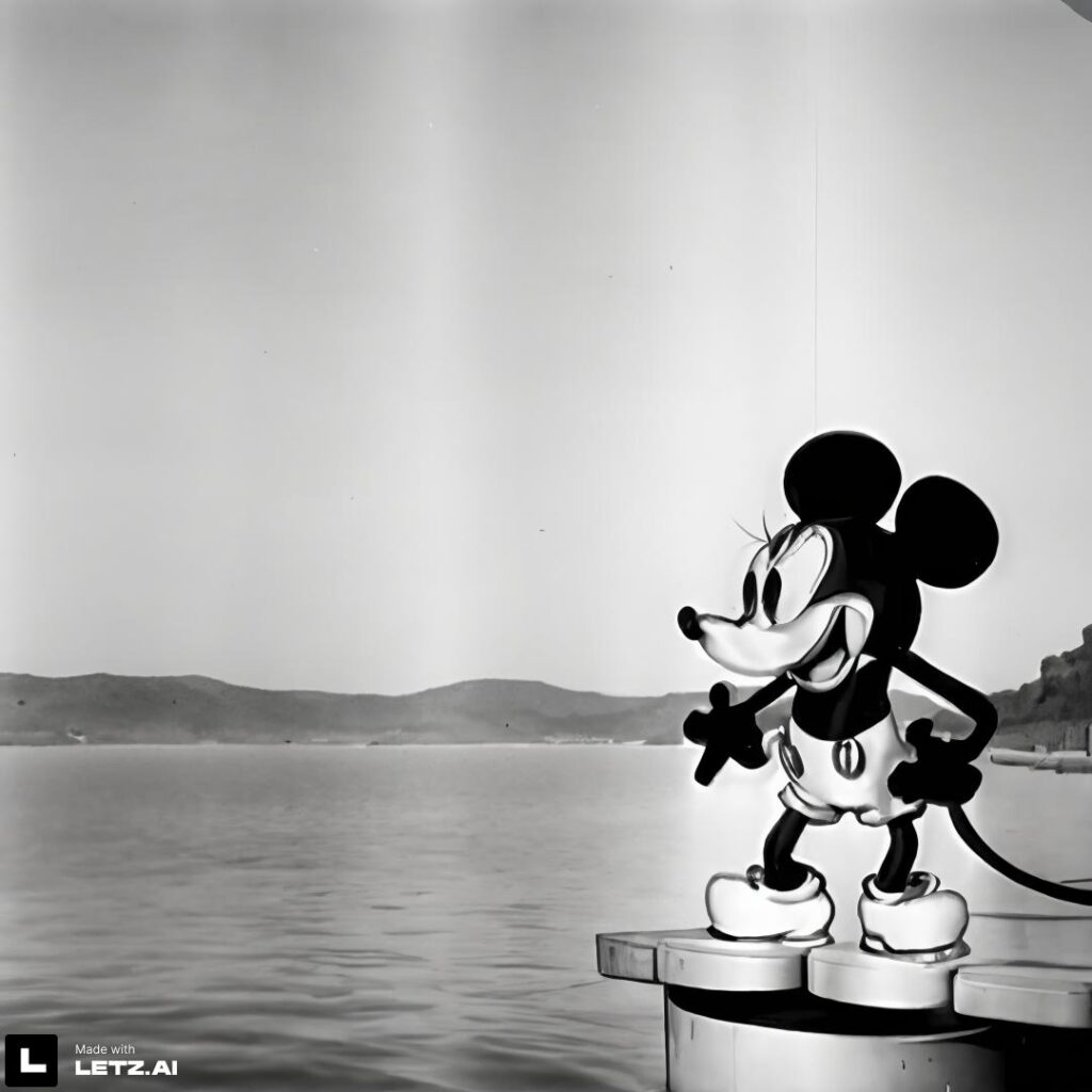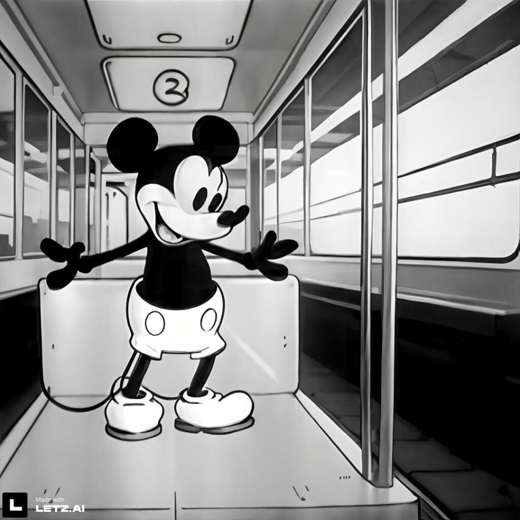 Le film joue aujourd’hui un rôle particulier dans le contexte de l’IA générative. En 2023, les droits d’auteur sur le premier Mickey Mouse sont arrivés à expiration. 75 ans après sa publication, l’œuvre est tombée dans le domaine public. Cette libération juridique a ouvert la voie à de nouveaux usages créatifs : par exemple, les utilisateurs de LetzAI ont pu entraîner légalement un modèle inspiré de ce Mickey originel et l’imaginer dans des scènes contemporaines. Ci-dessous, quelques images générées par le créateur luxembourgeois Biitz en témoignent.
