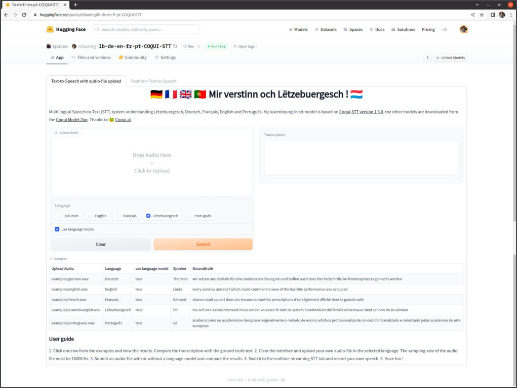 My HuggingFace demo space with Coqui-STT