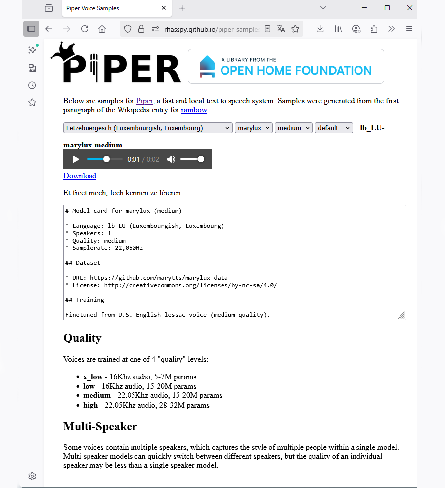 • Mai 2025 : Michel Hansen (alias Synesthesiam), ancien contributeur au projet Coqui-TTS, publie une nouvelle version de son modèle luxembourgeois Piper TTS.