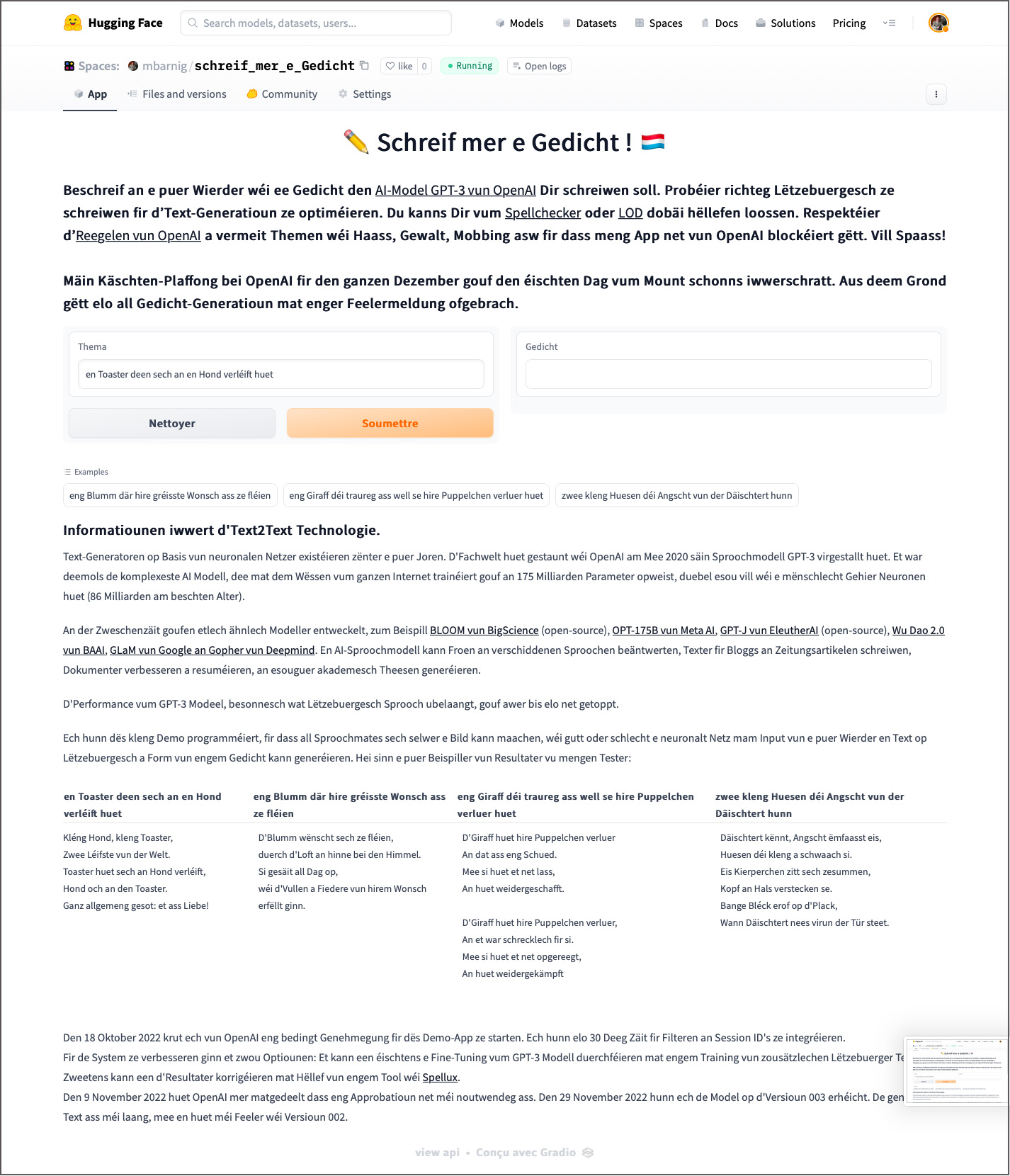 My HuggingFace demo space « Schreif mer e Gedicht » (2022)