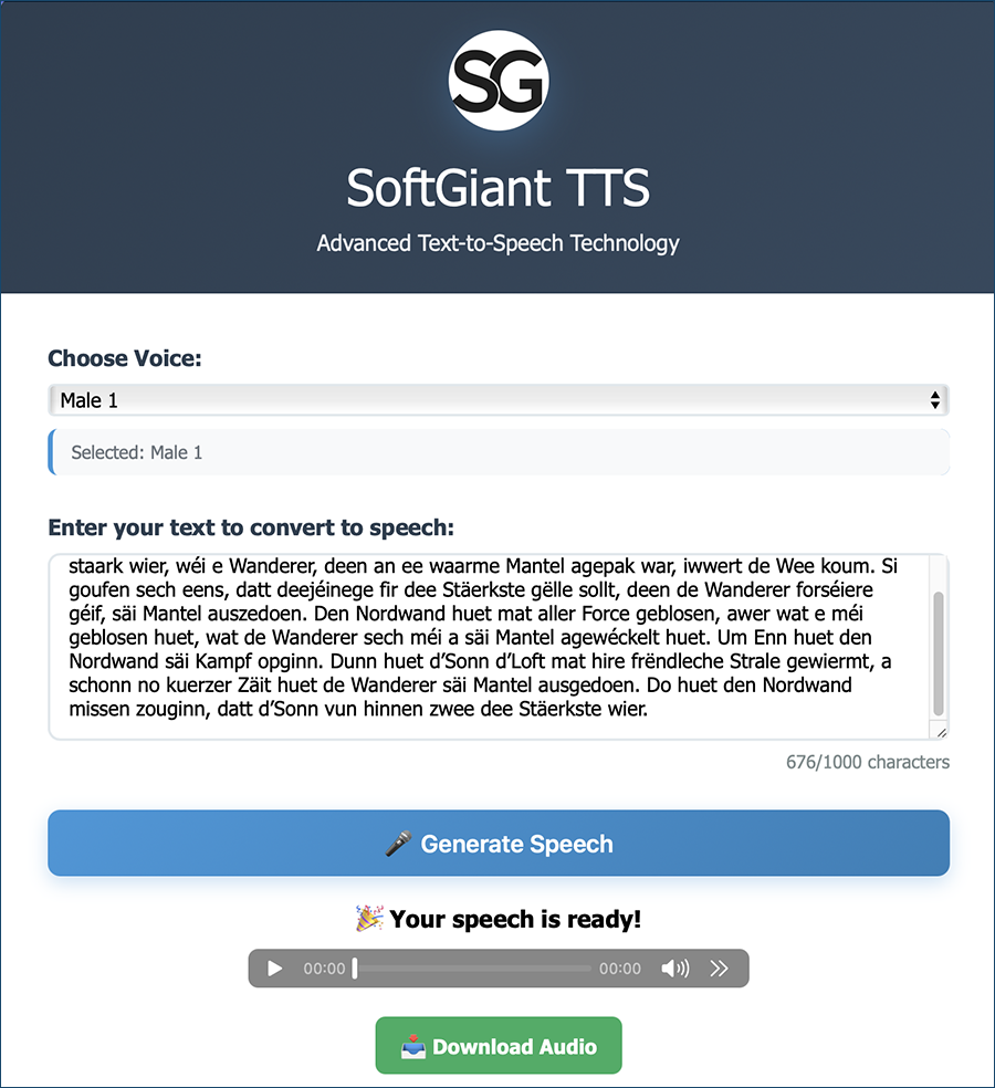 • Juin 2025 : la start-up luxembourgeoise SoftGiant TTS présente son premier modèle luxembourgeois. Malheureusement, la licence de la base du ZLS utilisée pour l’entraînement ne permet pas une exploitation commerciale.