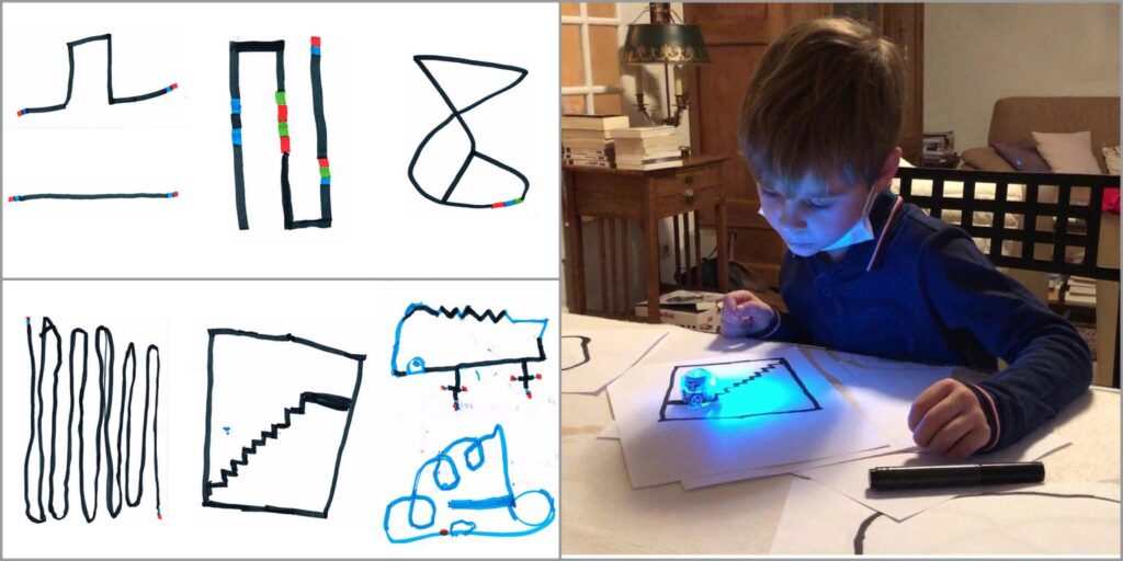 J’avais montré à mes petits-enfants comment tracer un parcours sur une feuille avec un feutre noir, incluant des rectangles colorés, pour programmer le petit robot OzoBot. Mes exemples de circuits sont présentés en haut de la figure à gauche ci-après. Les parcours tracés par mes petits-enfants sont affichés en bas. Le petit robot à perdu sa tête en circulant dans les escaliers, loopings et courbes dessinés. Décidément les enfants aiment la complexité.